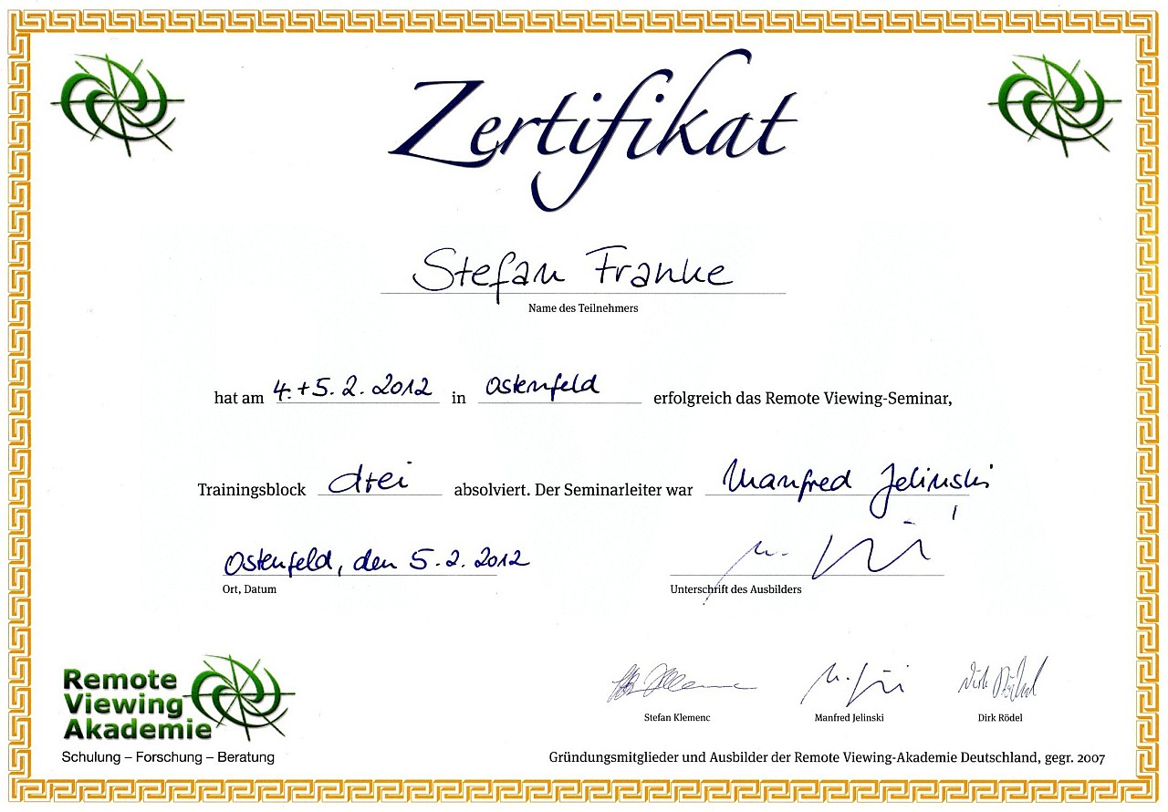 04 bis 05. Februar: Absolvierung einer formalen Remote Viewing-Ausbildung (bis Stufe 6) an der Remote Viewing-Akademie in Nordfriesland.